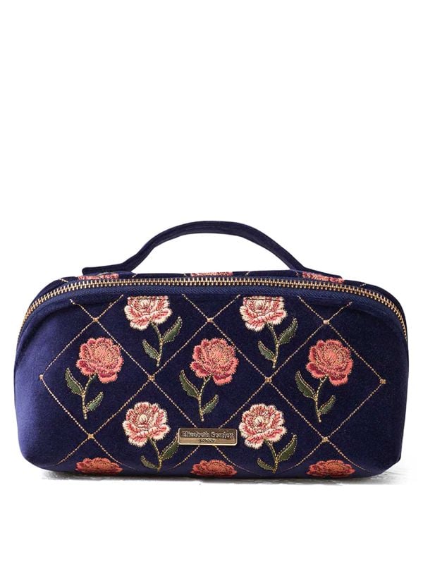 The Rose Open Flat Makeup Bag from Elizabeth Scarlett features an embroidered rose motif set on a velvet base with diamond stitching. The compact case has a top carry handle and Zipper opening with metal hardware, revealing a central zipped divider that creates two main compartments and elasticated internal side pockets for smaller items. A metal brand plaque adorns the front. This thoughtfully organised makeup bag is ideal for travel, keeping cosmetics and toiletries arranged and easy to access.