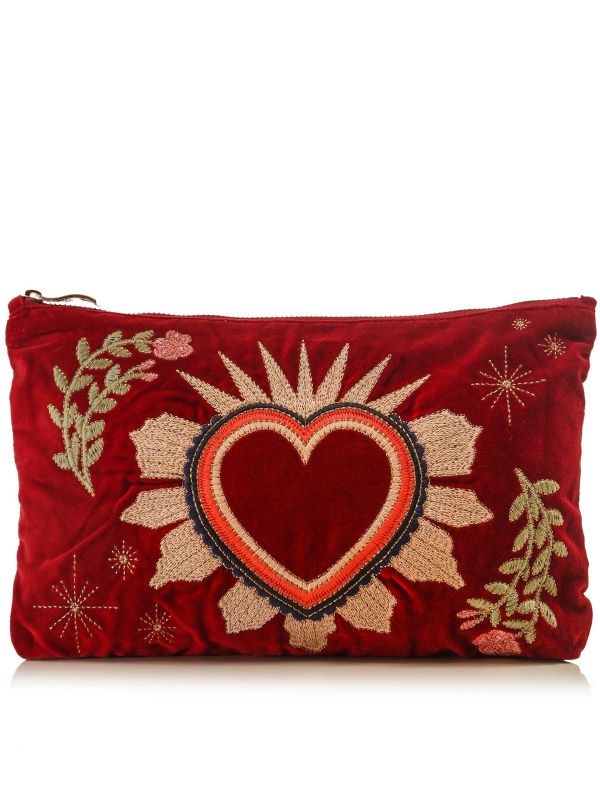 Elevate your accessories collection with the Elizabeth Scarlett Sacred Heart pouch. This deliciously soft velvet pouch bag fastens with a gold zipper and features an intricately detailed heart design with stars and florals embroidered on both the front and back. Big enough to carry your essentials while completing every outfit.