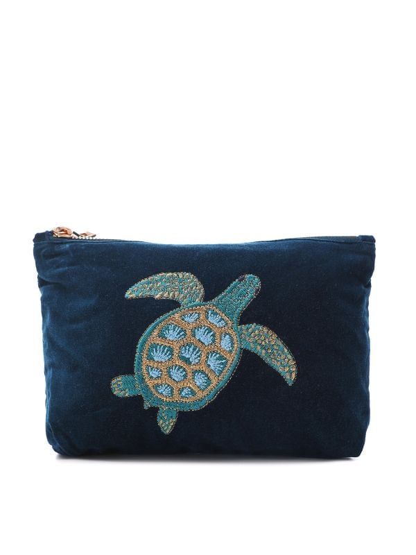 The Elizabeth Scarlett Turtle Conservation mini pouch is a small accessory that you can use as a mini clutch, a makeup bag or for holding any other essentials. This Elizabeth Scarlett mini pouch showcases an embroidered turtle motif with intricate gold threads on a soft velvet base. It has a gold zip fastening and can easily fit in your handbag, making it effortless to organise your things.