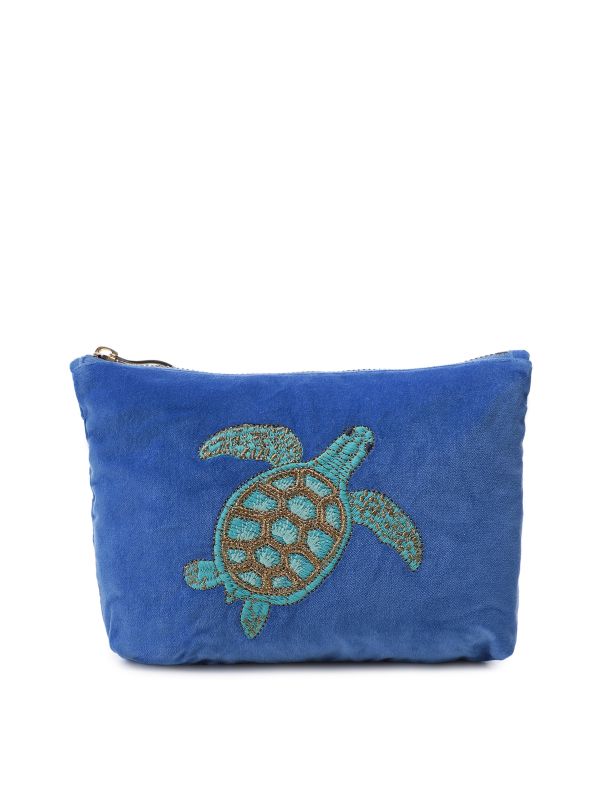 The Turtle Conservation Mini Pouch by Elizabeth Scarlett is a compact accessory you can use as a clutch bag or toiletry bag for transporting your essentials. Fashioned with a velvet base, this double sided design showcases a beautiful turtle motif detailed with golden threads. This Elizabeth Scarlett bag has a pure cotton lining and closes with a gold zip engraved with the brand's initials.