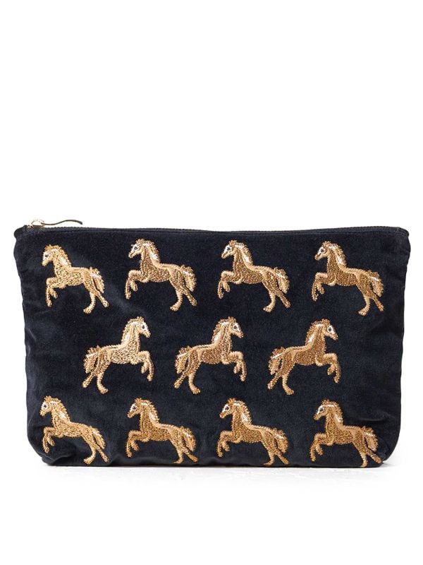 Channel a spirit of freedom with the Elizabeth Scarlett Wild Horses Everyday Pouch. Embroidered in gold thread on both sides, a herd of wild horses gallop across a luxurious landscape of 100% cotton velvet. The gold zip closure adds a hint of shine, securing your essentials in a soft cotton-lined interior.