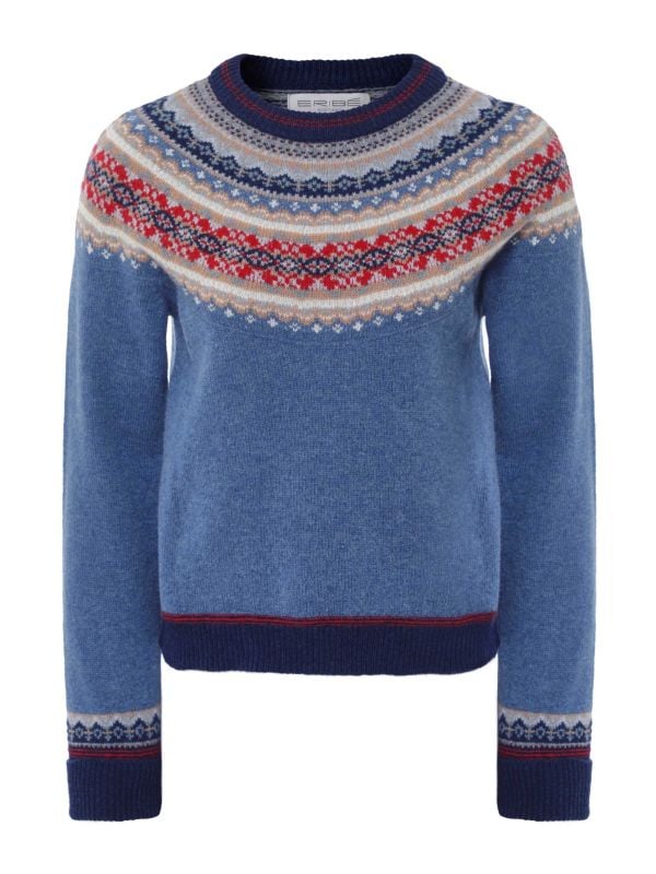 The ERIBÉ Alpine Short Jumper presents a crew‑neck silhouette accented by a multi‑motif Fair Isle yoke. Knitted in 100% virgin wool, it features long sleeves and ribbed cuffs and hem for a tidy finish. The patterned yoke continues across the shoulders and upper sleeves, adding textured detail to the knit. Cut to a shorter body that layers neatly over shirts or pairs with high‑waisted skirts and jeans, this jumper offers a cosy, structured knit option for cooler seasons.