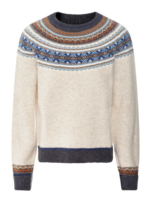 The Eribé Alpine jumper is a short wool jumper crafted from pure virgin wool. This Eribé jumper features a round neckline, extra long cuffs and ribbed trims. It showcases a Scottish Fair Isle yoke pattern and matching Fair Isle patterned sleeve endings. Soft and cosy, you can style it easily with denim or a skirt and tights.