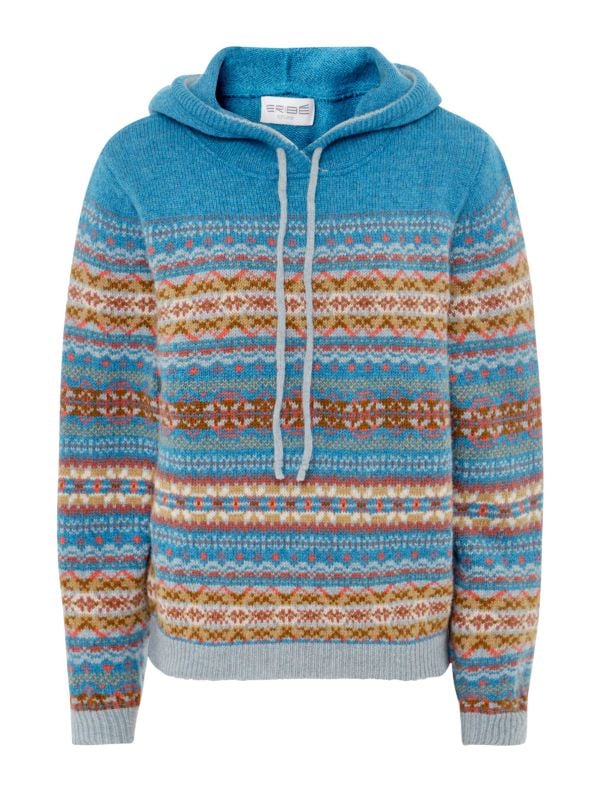 Elevate your knitwear collection with Eribé's Kinross hoodie, a great alternative to a jumper or cardigan. This colourful Eribé hoodie is made in Scotland from 100% virgin wool, offering a soft handle. Featuring an all-over Fair Isle pattern, it has a drawstring hood, ribbed edges and roll-over cuffs. Keep things simple and style yours with a pair of jeans.