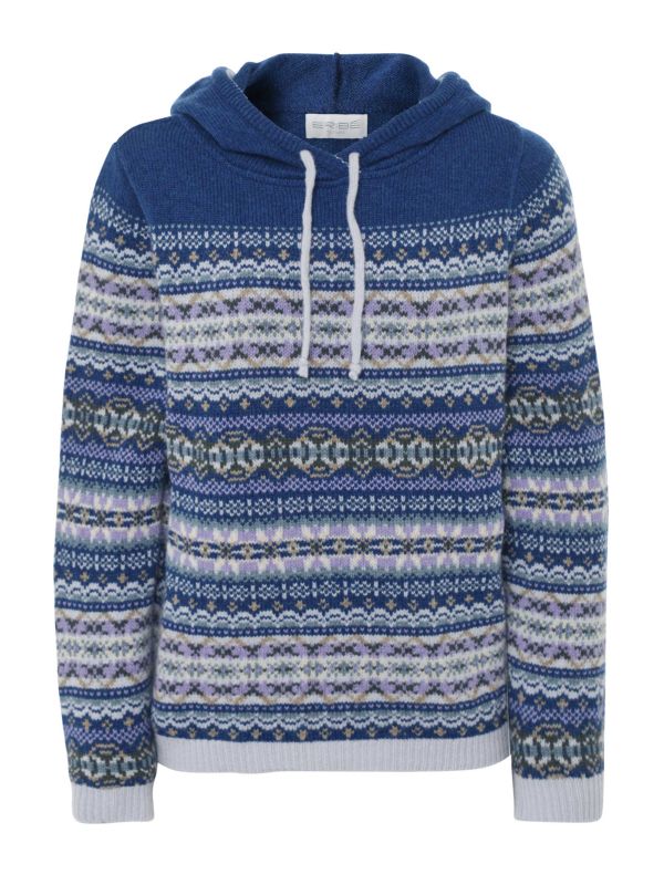 The ERIBÉ Kinross Hooded Jumper is a cosy knit crafted in 100% virgin wool, featuring a traditional Fair Isle-inspired banded pattern. It is designed with a shaped hood and drawcord, long sleeves and ribbed cuffs and hem for a neat finish. The knitted construction gives a soft handle and natural warmth, making it a practical layering piece for cooler days. Wear it with jeans or relaxed trousers for an easy seasonal look.