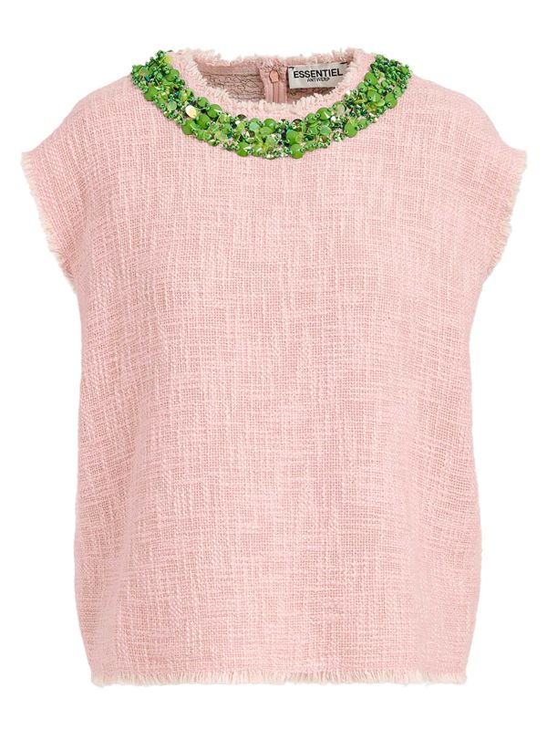 The Essentiel Antwerp Field top is a dazzling style sure to elevate your day to night looks. Crafted from a cotton tweed fabric and cut for a boxy shape, this sleeveless top has a hidden zip fastening to the back, frayed edges and a round neckline carefully decorated with green bead and sequin embellishments. Simply pair with a minimalist pair of shorts or trousers and some pared back jewellery. No need for a statement necklace.