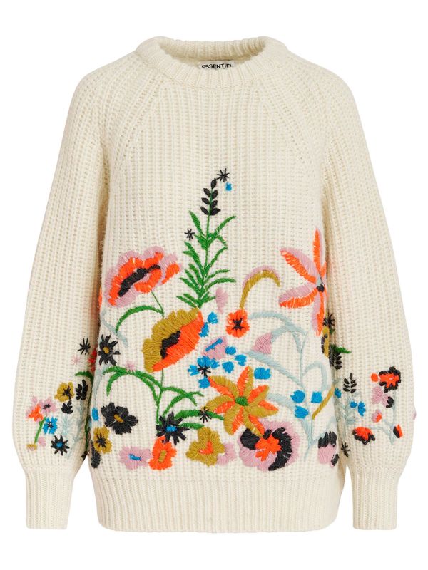 It features a classic round neckline and ribbed trims, adding subtle structure to the look. What truly sets this piece apart is its playful floral embroidery details, which lend a touch of whimsy and femininity. Whether paired with jeans for a casual day out or layered over a slip dress, this Essentiel Antwerp jumper brings effortless style and sophistication to any outfit.