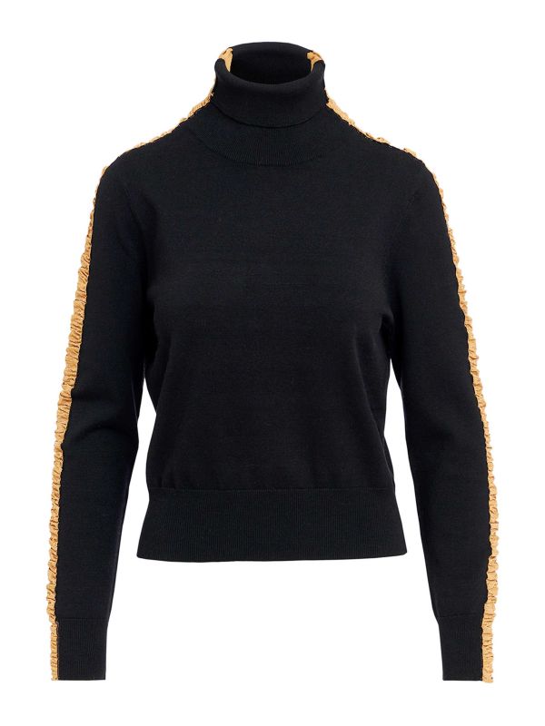 The Essentiel Antwerp Gertini sweater is a chic, modern must-have for any fashion-forward wardrobe! Crafted from a luxurious viscose blend, this fine-knit piece drapes beautifully, offering a soft, comfortable feel against the skin. The turtleneck adds a touch of timeless elegance, while the ruched golden tape trim introduces a playful twist, elevating the design with a hint of glam.