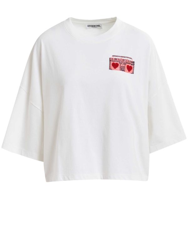 A classic white tee with a playful twist, discover the Hadio T-Shirt by Essentiel Antwerp. Crafted from 100% cotton, this Essentiel Antwerp t-shirt has a boxy silhouette and a cropped length, perfect for pairing with your favourite jeans. It's finished with a crew neck, short sleeves, a straight hem and a pink, bead-embellished radio graphic on the chest to add a pop of colour.