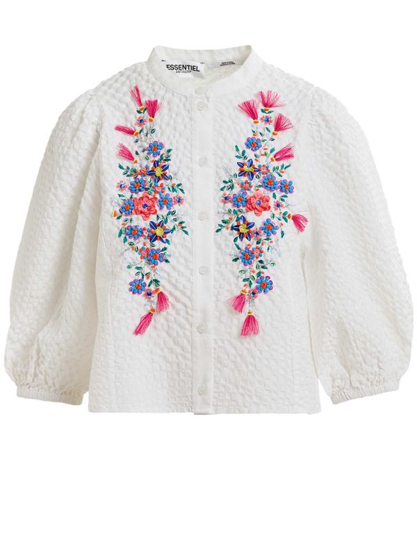 The Heartfelt shirt by Essentiel Antwerp is an elegant piece and the perfect choice for spring. Designed for a close fit, it has a mandarin collar, puffed shoulders, 3/4 voluminous sleeves with elasticated cuffs and a button closure. It's finished with bead and sequin floral embroidery on the front, adding a vibrant touch to this stunning Essentiel Antwerp shirt.