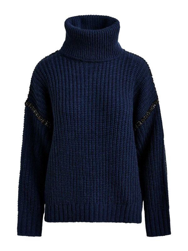 The Essentiel Antwerp Indsay Embellished Jumper features a chunky, removable roll neck and textured knitted stitch for a substantial handfeel. It has dropped shoulders and long sleeves, with beaded trims that run across the upper arm as a decorative accent. Ribbed cuffs and hem provide structure to the relaxed, boxy silhouette, making it ideal for layering over tailored trousers or skirts. Wear it with boots and a long skirt or under a coat when temperatures dip. The beaded trims add discreet interest without overpowering the shape.