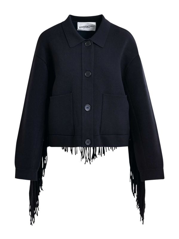 Essentiel Antwerp's Istern Jacket is the ultimate statement piece featuring dramatic fringe details that sway as you move. A fine knit, this Essentiel Antwerp jacket is cut for a relaxed fit with a cropped length. It has a collar, dropped shoulders, button fastening with tonal buttons and two patch pockets.