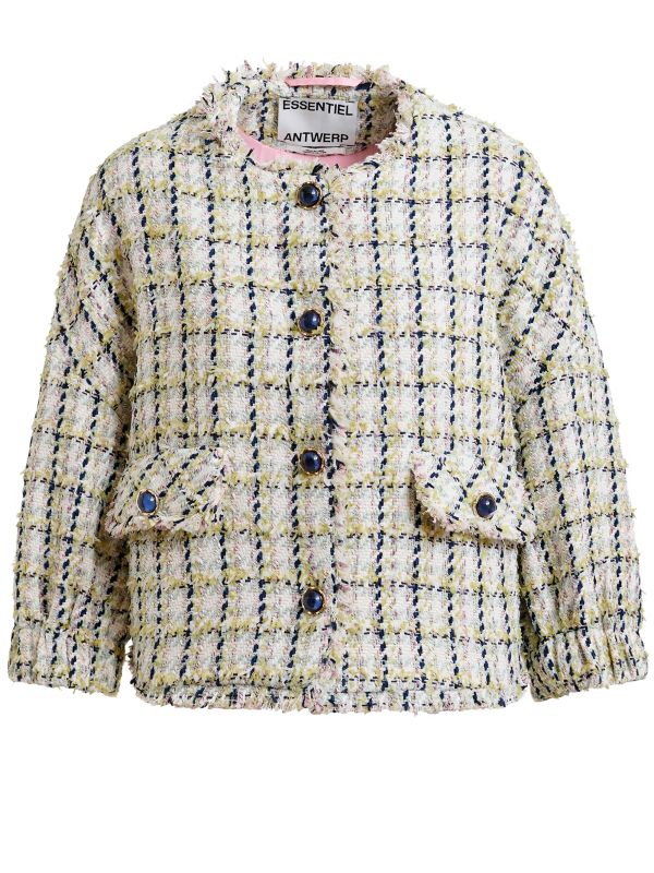 The Essentiel Antwerp Jayden Oversized Bouclé Jacket is a boxy, shortline jacket that refreshes tailored dressing with a playful checked texture. It fastens with large jewel-effect buttons set in metal trims and has twin flap pockets for everyday practicality. Frayed edges at the hem and cuffs add soft, tactile interest while the relaxed shoulders and long sleeves make it ideal for layering over shirts or knits. Finished with a neat round collar, it lifts both casual and smarter ensembles with a polished finish.
