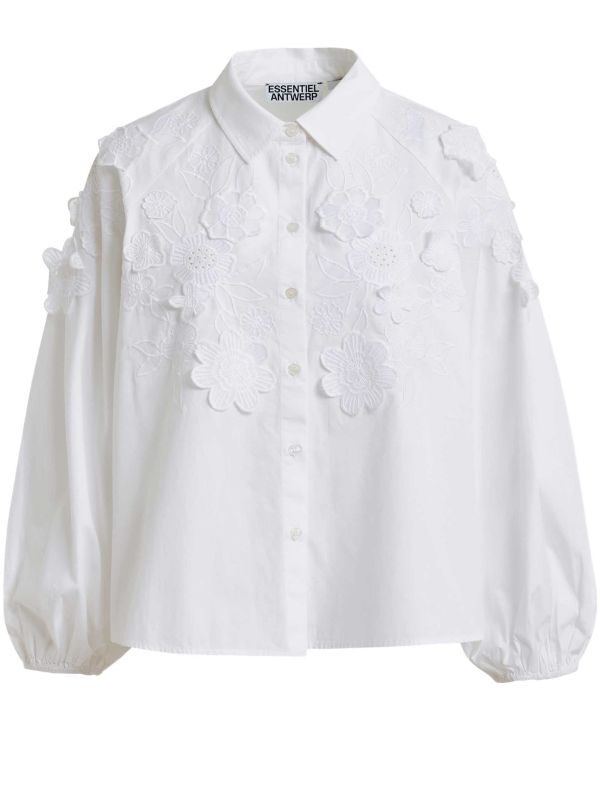 The Joella Cotton Shirt With Appliqué Flowers is a sculptural button-through shirt accented with raised floral appliqués across the chest and shoulders. It has a pointed collar, generous balloon sleeves and elasticated cuffs for a softly voluminous silhouette. The shirt fastens with a neat row of buttons and sits in a relaxed shape that tucks in or wears loose. This piece from Essentiel Antwerp brings tactile detail to everyday dressing and pairs easily with tailored Pants or cropped denim for a contemporary look. Wear it day to night.