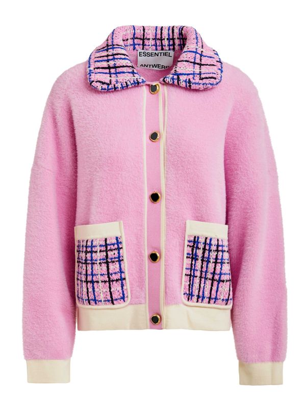 The Joilu Knitted Textured Cardigan from Essentiel Antwerp is a relaxed, boxy cardigan with tactile knitted construction. It features a textured checked collar and matching pocket panels, bold gold-tone buttons with enamel centres and ribbed placket, cuffs and hem. Patch pockets sit low on the front for a casual finish while the softly structured shoulders and long sleeves keep the silhouette wearable. Wear over a shirt or knit for layered looks; this piece brings playful pattern and tactile detail to everyday outerwear for seasonal layering.