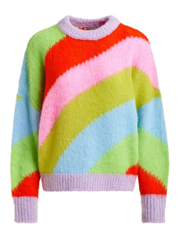 The Jolor Intarsia Knit Striped Sweater offers a graphic, textured take on knitwear. Designed by Essentiel Antwerp, it features a crew neckline, long sleeves and ribbed trims at the cuff and hem. The brushed, fluffy surface and wide diagonal stripes give tactile interest and movement, while the relaxed, slightly boxy silhouette layers easily over shirts or under coats. Pair with tailored Pants or denim for a contemporary contrast and playful everyday styling.