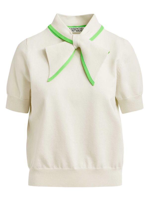 The Jonda Fine-Knit Polo is a knitted short-sleeve top from Essentiel Antwerp. It features a neat polo collar with an integrated tie-neck scarf edged in contrasting trim, plus ribbed cuffs and hem for structure. Cut to a slightly boxy silhouette, the pullover slips on easily and layers well under jackets or over skirts and jeans. A refined everyday knit that combines a sporty polo shape with a feminine neck detail for versatile styling.
