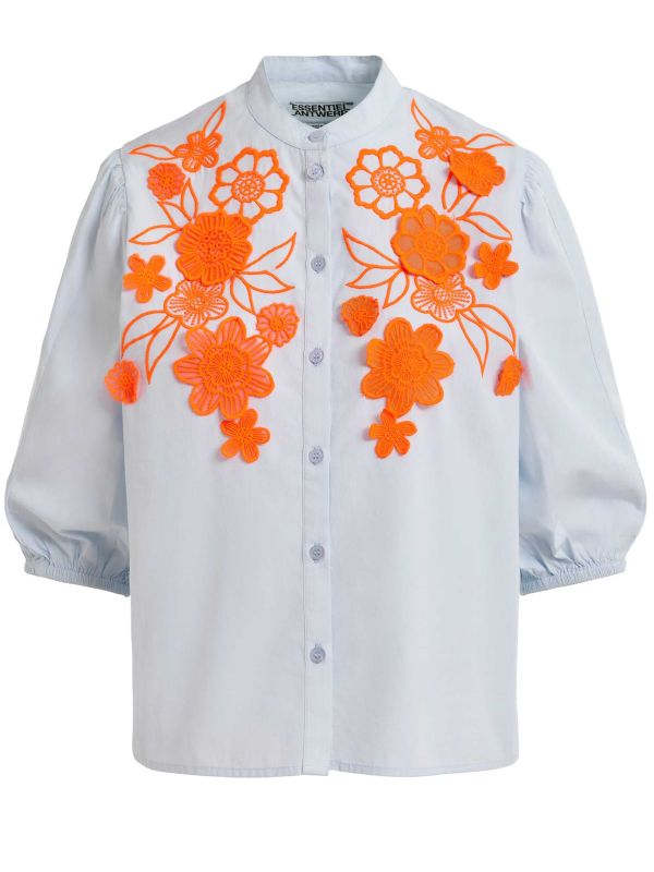 The Essentiel Antwerp Jorja Appliqué Flower Shirt is a button-through style with a neat stand collar and striking floral appliqué across the chest. It features softly gathered shoulders and voluminous mid-length sleeves that finish with elasticated cuffs for a defined shape. The detailed appliqué and embroidered motifs add texture and depth to the front, while the relaxed silhouette pairs equally well with tailored Pants or casual denim for a versatile daytime look.