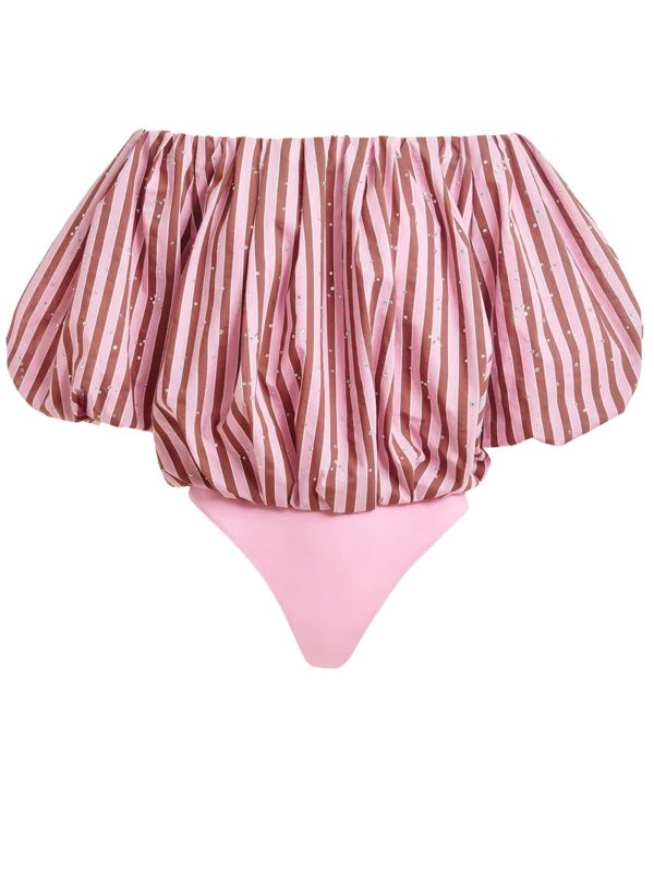 The Rhinestone Gathered Puff Sleeve Bodysuit from Essentiel Antwerp is an off-the-shoulder bodysuit with a voluminous blouson body and elbow-length puff sleeves. Vertical stripes and scattered rhinestone embellishments add decorative texture across the gathered silhouette. An elasticated neckline and hem create the softly billowed shape while the fitted bodysuit base secures the style for a neat tuck into Pants or skirts. Wear it with tailored Pants for an elevated evening look or style with wide-leg bottoms for a contemporary daytime outfit. Ideal for events and evening gatherings.