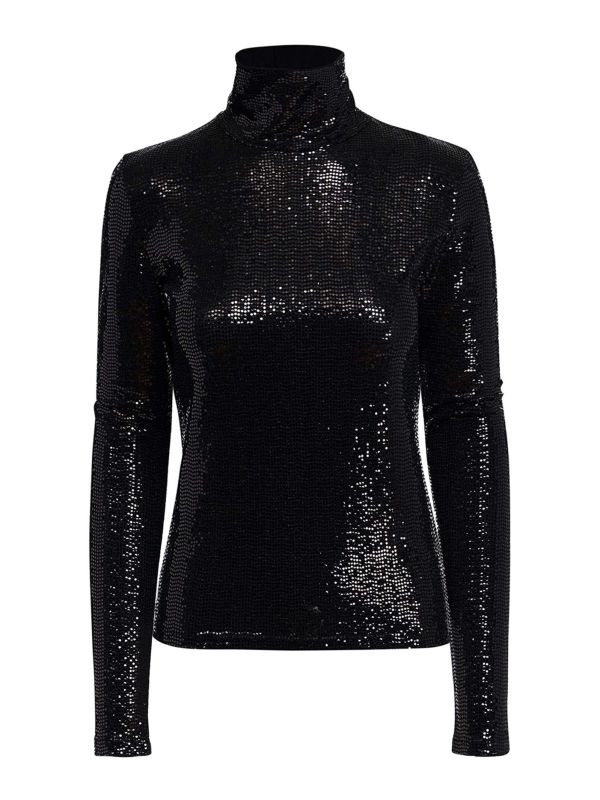The Essentiel Antwerp Gong top is a statement piece that masterfully blends sophistication with a touch of playful glamour. Crafted from a midweight stretch fabric, this top features a turtleneck and long sleeves for a sleek, close-fitting silhouette that hugs the body in all the right places.