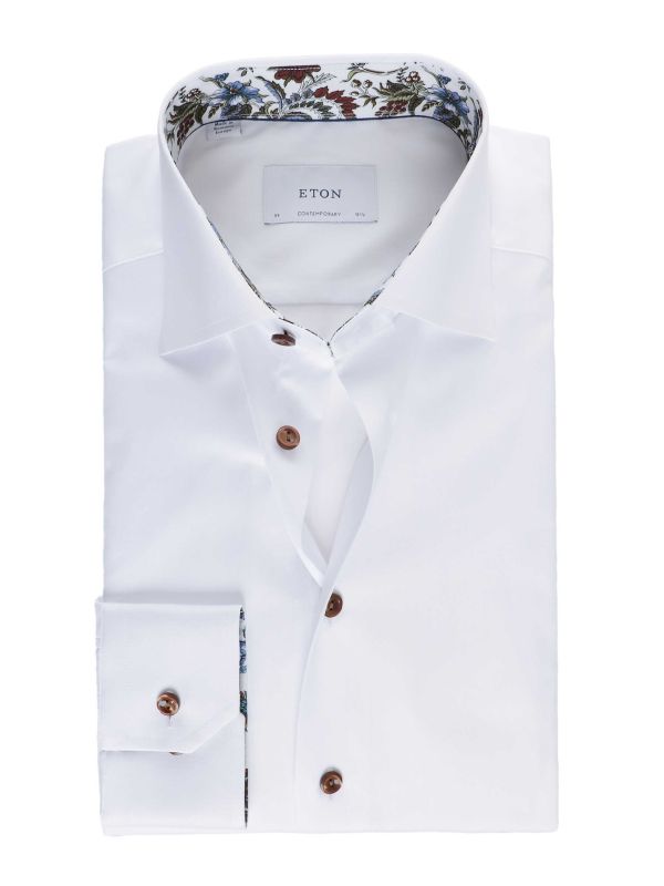 Designed in a contemporary fit, it features a sharp cut away collar, clean French placket, and adjustable button cuffs for versatile styling. A discreet floral lining at the collar and cuffs adds a touch of personality, making the Eton shirt ideal for both business and after-hours dressing.