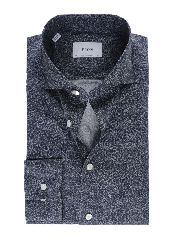 The contemporary fit creates a sharp silhouette, complemented by a modern spread collar, sleek French placket, and adjustable button cuffs. Featuring a detailed ornamental floral print, this long-sleeve Eton shirt adds a sophisticated edge to any smart-casual or formal ensemble.