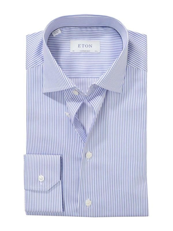 The Eton striped shirt offers a refined take on classic stripes, expertly crafted from cotton twill for a rich texture and lasting comfort. With its cut away collar and French placket, this Eton shirt delivers a clean, sophisticated look suitable for both formal and smart-casual occasions.