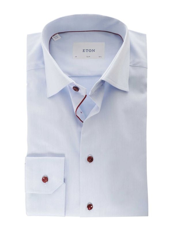 The Eton contrast trim shirt is a modern twist on a classic wardrobe essential, crafted from premium cotton twill for a smooth, polished finish. Designed to be easy-iron and wrinkle-resistant, it ensures a crisp, sophisticated look all day. The cut-away collar and French placket are complemented by contrast placket trim and buttons for subtle, contemporary detailing. With long sleeves, adjustable button cuffs, and a slim fit, this Eton shirt delivers a sharp, tailored silhouette ideal for both professional and smart-casual settings.