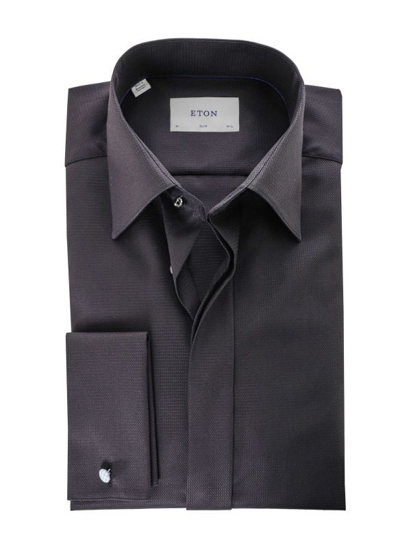 The Eton dobby tuxedo shirt is a refined choice for formal occasions, crafted from high-quality cotton dobby with a subtle textured finish for elegant style. Its easy-iron, wrinkle-resistant fabric ensures a crisp, polished look from start to finish. Featuring a moderate cut-away collar and a concealed stud fly placket, the Eton shirt exudes understated sophistication. Long sleeves with French cuffs and a slim fit create a sharp, tailored silhouette, making it the perfect companion for tuxedos and formal attire.
