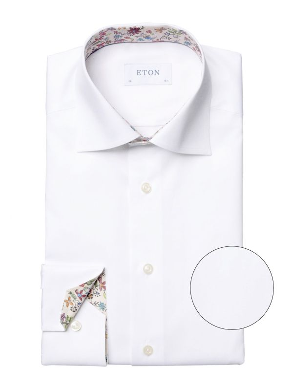 Elevate your formal essentials with the Eton floral trim shirt. Expertly tailored to a slim fit and crafted in the label's signature twill cotton, the white shirt offers a contoured silhouette and exceptional drape and lustre. Featuring a spread collar, adjustable cuffs, French placket and pearlescent buttons, whilst the floral linings add a subtle flamboyant detail synonymous with the Swedish shirtmakers.