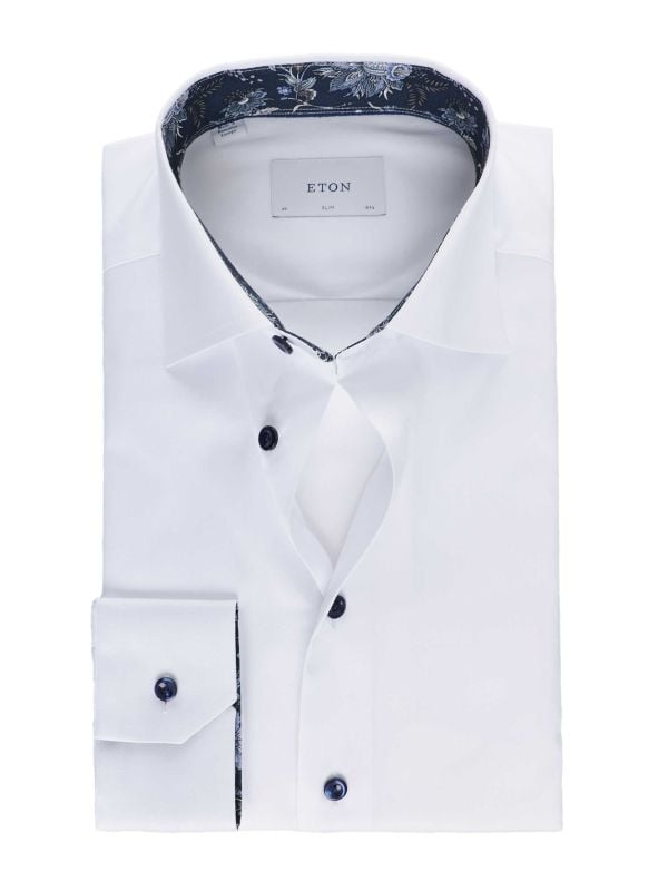 Designed in a slim fit for a sharp, streamlined silhouette, the Eton shirt features a cut away collar, French placket, and long sleeves with adjustable button cuffs. A discreet floral trim at the collar and cuffs adds a sophisticated touch of character, perfect for understated style with personality.