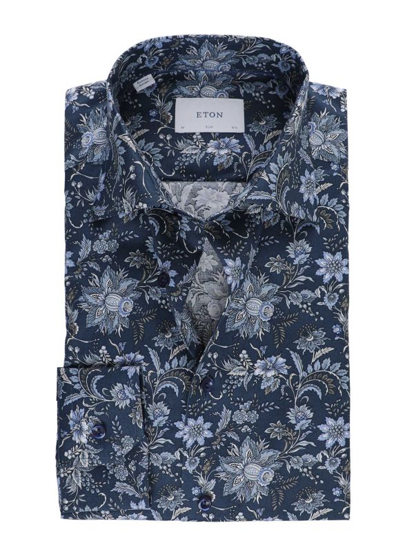 Cut for a slim fit, it features a modern cut away collar, clean French placket, and adjustable button cuffs for a tailored silhouette. The ornate floral print adds a bold yet sophisticated edge, making the Eton shirt perfect for both office styling and evening occasions.
