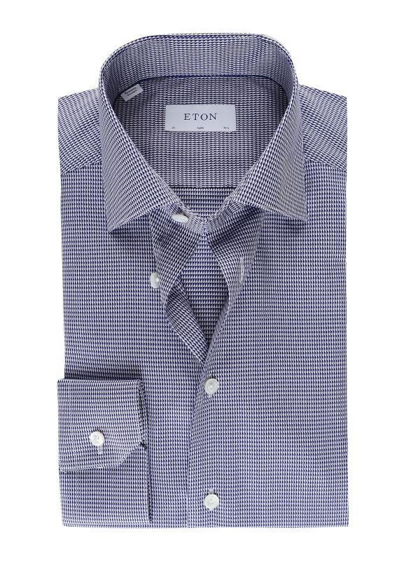 Lend your formal attire modernist character with the Eton geometric print shirt. Tailored to a slim fit and crafted in premium cotton, the shirt offers a flattering silhouette and superb drape and lustre. Featuring a spread collar, sleek French placket and adjustable cuffs, whilst the micro geometric pattern makes for a contemporary aesthetic.