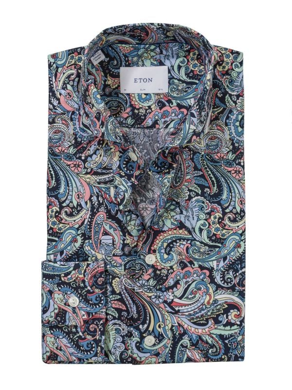 The Eton paisley shirt is a statement piece that merges refined tailoring with bold sophistication. Cut from premium cotton twill, it offers a smooth, structured feel with a subtle sheen, ensuring both comfort and durability. Designed in a modern slim fit, it features a sharp cutaway collar that adds a contemporary edge, while the French placket enhances its clean, polished aesthetic.
