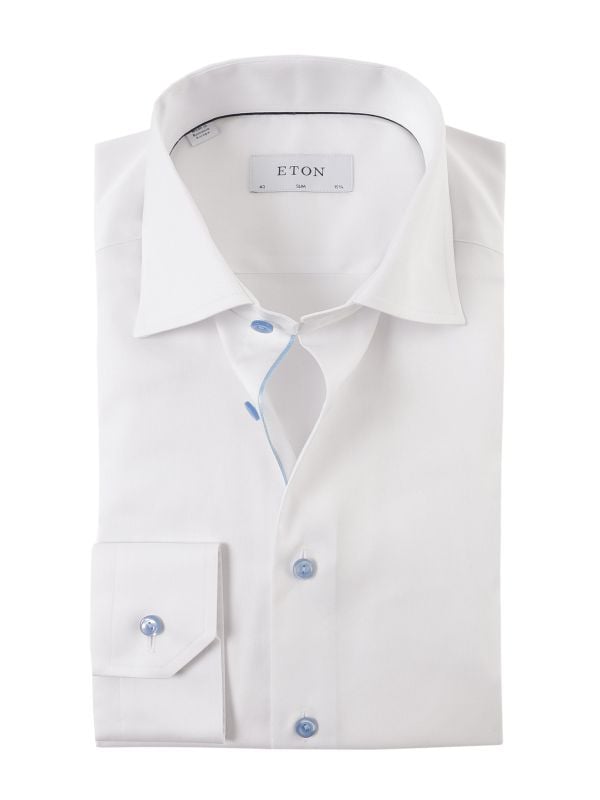 Elevate your formal essentials with the Eton signature twill shirt. Expertly crafted in the label's signature twill cotton and cut to a slim fit, the white shirt offers a masculine silhouette, exceptional drape and great lustre. Featuring a pointed collar, adjustable button cuffs and a crisp and versatile white hue, whilst the pale blue pearlescent buttons offer a playful and luxurious finishing touch.