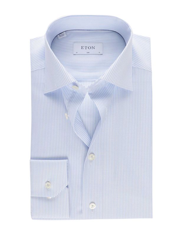 The distinctive striped pattern adds a timeless allure, while its slim fit silhouette ensures a modern and flattering look that seamlessly transitions from the boardroom to evening engagements. Crafted with meticulous attention to detail, the Eton striped shirt effortlessly merges versatility with impeccable craftsmanship.