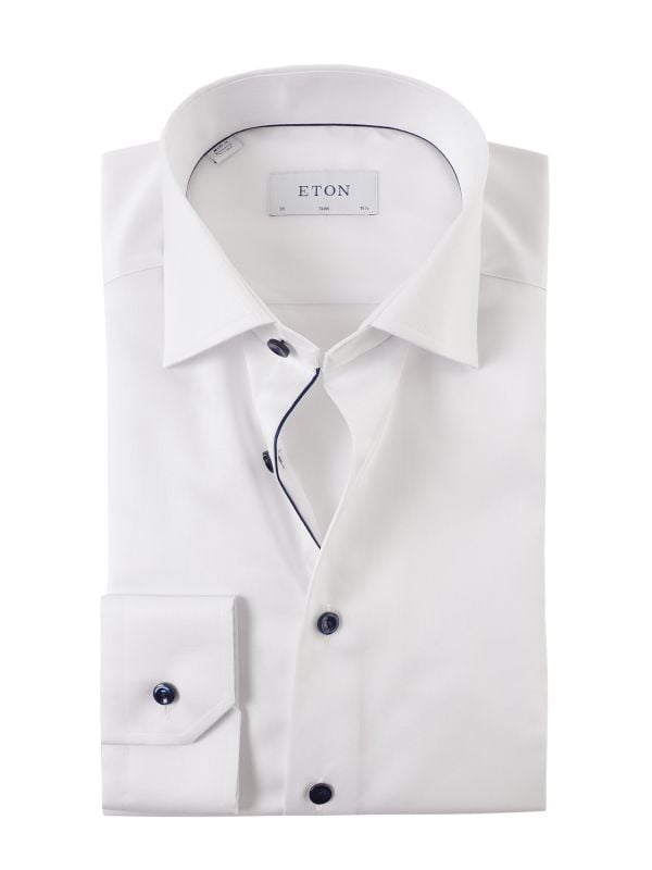 Essential and charming, the Eton slim fit twill shirt is sure to effortlessly complement both your on and off-duty attires. Exquisitely crafted from the iconic medium weight twill fabric, the refined shirt is detailed with contrasting piping and matching buttons that add subtle dimension and a superior luxury feel. Complete with traditional shirting features such as a cut away collar and angled cuffs, wear under your go-to tailoring or tuck into jeans depending on the occasion.