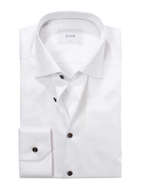 The contrast buttons add a contemporary edge to the traditional design, enhancing its refined appeal. With a slim fit, this Eton shirt provides a sharp, streamlined silhouette, making it a versatile choice for both formal and smart-casual occasions, ensuring you look effortlessly polished.