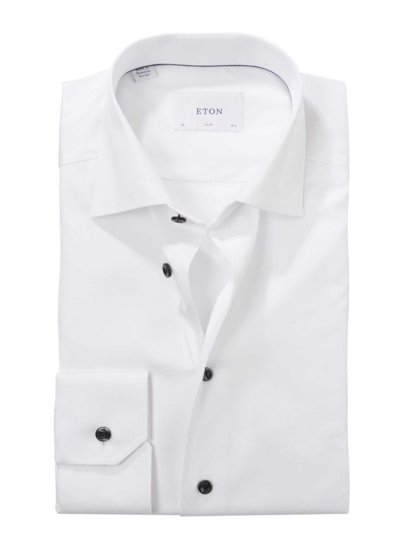 Featuring long sleeves with adjustable buttoned cuffs, the shirt ensures a customised fit, while the contrast buttons provide a subtle but striking contrast that elevates its overall design. With its slim fit, this Eton shirt creates a sleek, tailored silhouette, making it an ideal choice for both business and social events where a sharp, stylish appearance is key.