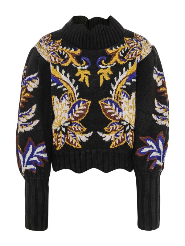 The Arabesque Paradise Jumper is a sculpted knit from FARM Rio, worked in a bold arabesque floral intarsia. It features a high, heavily ribbed funnel neck and a cropped body with a pronounced ribbed hem. Voluminous balloon sleeves sit over elongated, fitted rib cuffs for layered contrast, while dropped shoulders enhance the relaxed silhouette. The jacquard construction gives the piece depth and texture, making it a tactile option for seasonal layering and tailored skirts or trousers.