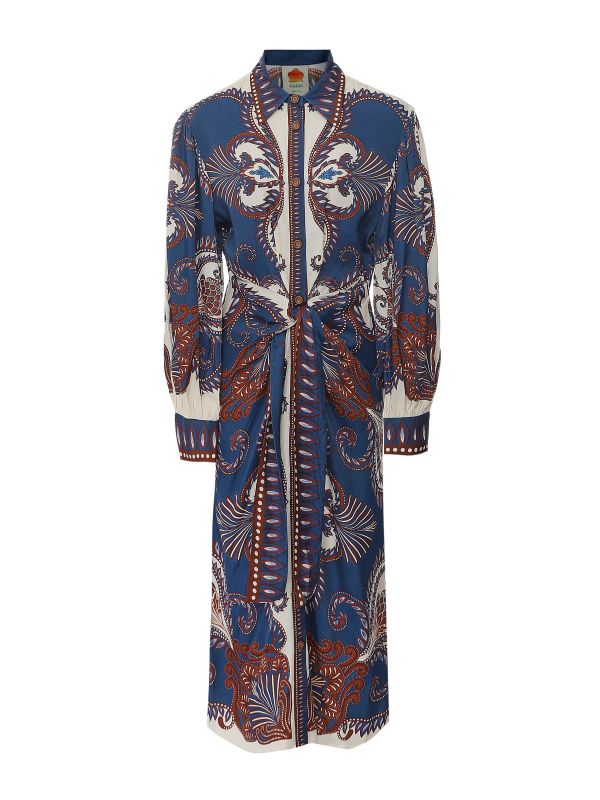 FARM Rio Arabesque Scarf Midi Dress is a shirt‑dress styled midi with a pointed collar and full button‑through front. Designed with a self‑tie waist and long gathered sleeves that finish with button cuffs, it falls to a mid-calf length for considered coverage. The design is printed with an ornate arabesque motif across the body and sleeves. Wear it loosely as an open layer or fastened and belted for a more defined silhouette. Style with mid-height boots or sandals to complete the look. Ideal for travel and seasonal dressing.
