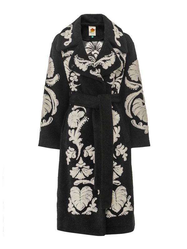 This Farm Rio coat is adorned with a pretty cream floral pattern on a black background. It features a collar neckline, press-button fastening and a tie belt for cinching the waist. It's crafted from a wool blend with fleece texture, ensuring a comfortable and warm wear while remaining a statement piece.
