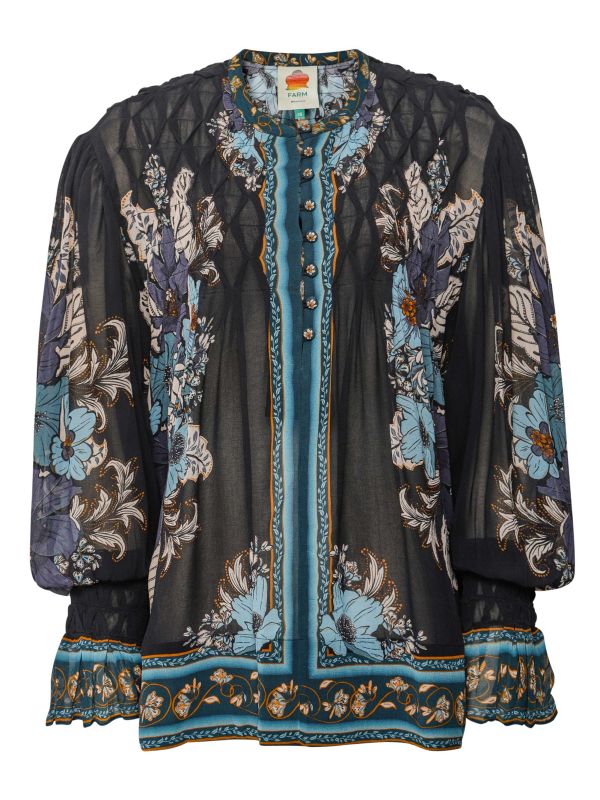 The Farm Rio Blossom tapestry blouse is a stunning addition to any wardrobe, crafted from soft, lightweight viscose that drapes beautifully against the skin. Its high neckline and buttoned placket add a touch of sophistication, while smocked details lend a playful twist to the design.