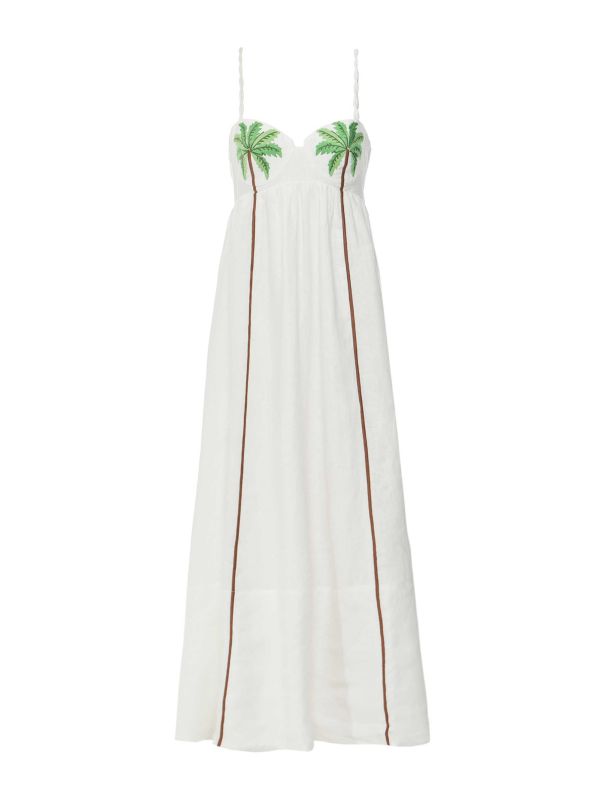 Introducing the Coconut Tree Maxi Dress from Farm Rio for your new wardrobe. Crafted from 100% linen with a cotton lining, this maxi dress boasts distinctive features including adjustable braided straps and a sweetheart neckline elevated by embroidered palm trees. With its airy fabric and loose cut, this is the perfect dress for soaking up the sun.