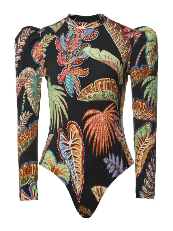 Introducing the Cool Foliage bodysuit from Farm Rio, a statement-making piece. Crafted from viscose, this bodysuit features a ribbed design with a high round neck, gathered details at the shoulders that create a puffed look, long sleeves and a bright and bold cool foliage print. The bodysuit fastens with snap buttons at the crotch, making it easy to get on and off. Suitable for any occasion, it can be styled with multiple outfits.