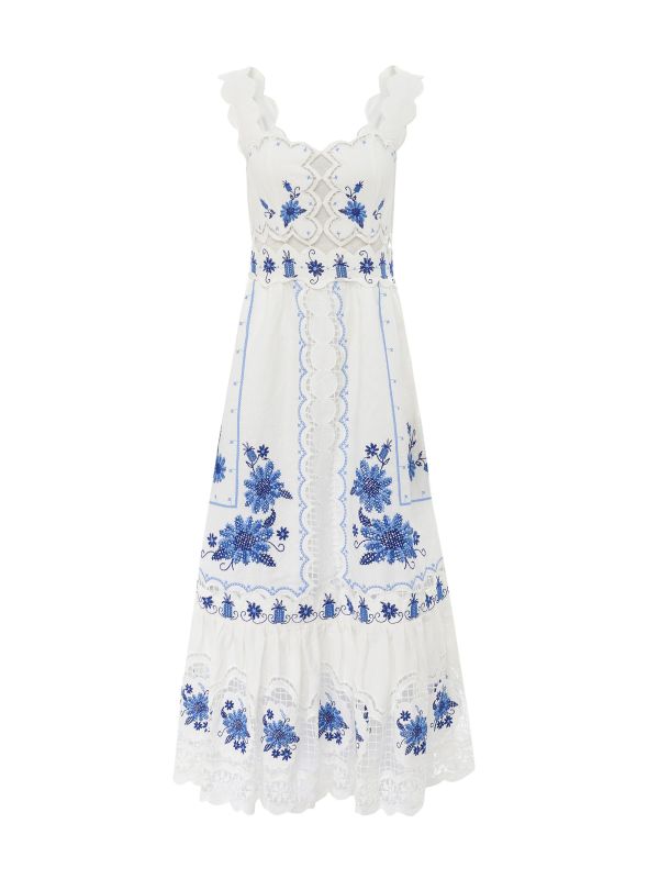 The Cross Stitch Richelieu Sunflower Midi Dress by FARM Rio is made from a linen and viscose blend for a breezy and comfortable fit. This FARM Rio midi dress is cut with a scallop trim neckline and straps and features cut-out details, Richelieu embroidery and vibrant blue embroidered floral patterns. Wear yours everywhere from garden parties to holiday dinners.