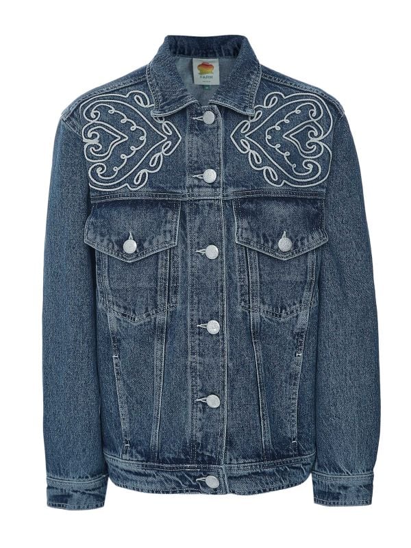 The Denim Cornely Buttoned Embroidered Jacket is a relaxed denim trucker from FARM Rio. It is defined by ornate embroidered motifs across the front yoke and a large embroidered design on the back that add texture and interest. Traditional trucker details include a full button front, twin flap chest pockets and practical side pockets, with button cuffs and a straight hem completing the silhouette. Wear it as an outer layer over knits or light shirts for a considered, layered look.