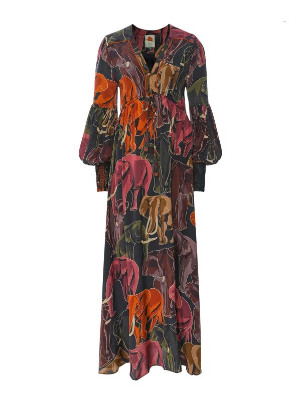 Enrich your dress collection with the charming Elephants Green Maxi Dress by Farm Rio. Made from viscose, this Farm Rio maxi dress is a whimsical style with a flattering, flowy silhouette. It has a deep V neckline, adjustable ties finished with beaded tassels, and long balloon sleeves with shirred cuffs, allowing versatility with sleeve length. Complete with ruffles and an all-over multi-coloured elephant print, this is a vibrant style for your seasonal wardrobe.