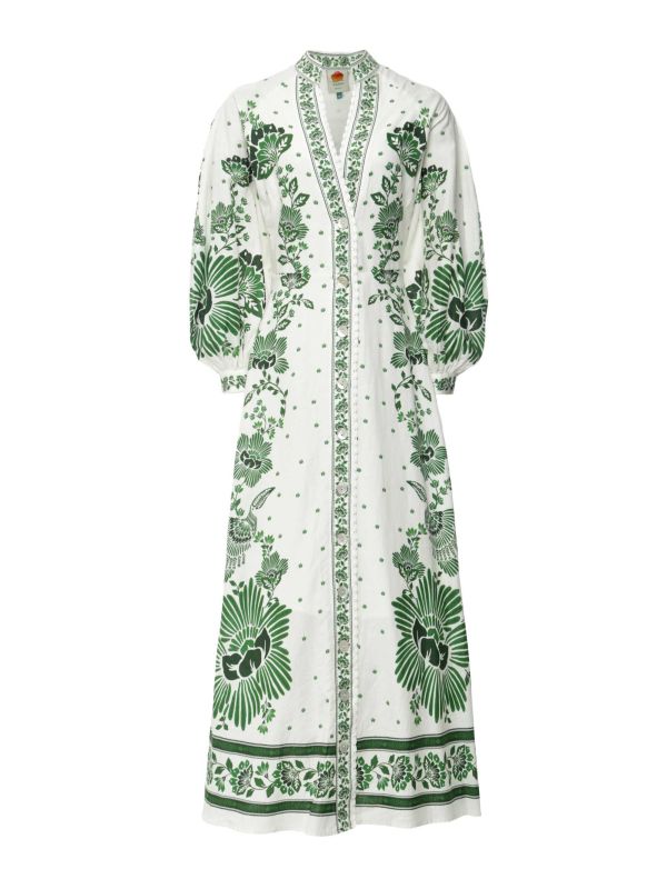 Bring your wardrobe to life with the Forest Soul off-white maxi dress from Farm Rio. This fit-to-flare style showcases a stand-up collar, a flattering V neckline with scalloped edge, long balloon sleeves with buttons at the cuff, and central buttons. This dress cinches slightly at the waist before falling into a full skirt, perfect for both day and night time looks. The finishing touch is the contrasting green floral patterns that cover the dress.