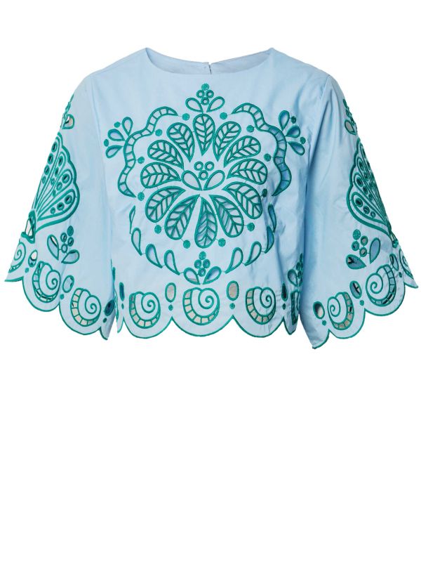 Curate a standout look in the Graphic Richelieu Crop Top from Farm Rio. Featuring a round neckline, single embellished button fastening to the back, short flutter sleeves and contrasting eyelet embroidery. Complete with scalloped edges and a cropped cut, this top is a must-have style for wearing with jeans, trousers or the matching midi skirt.